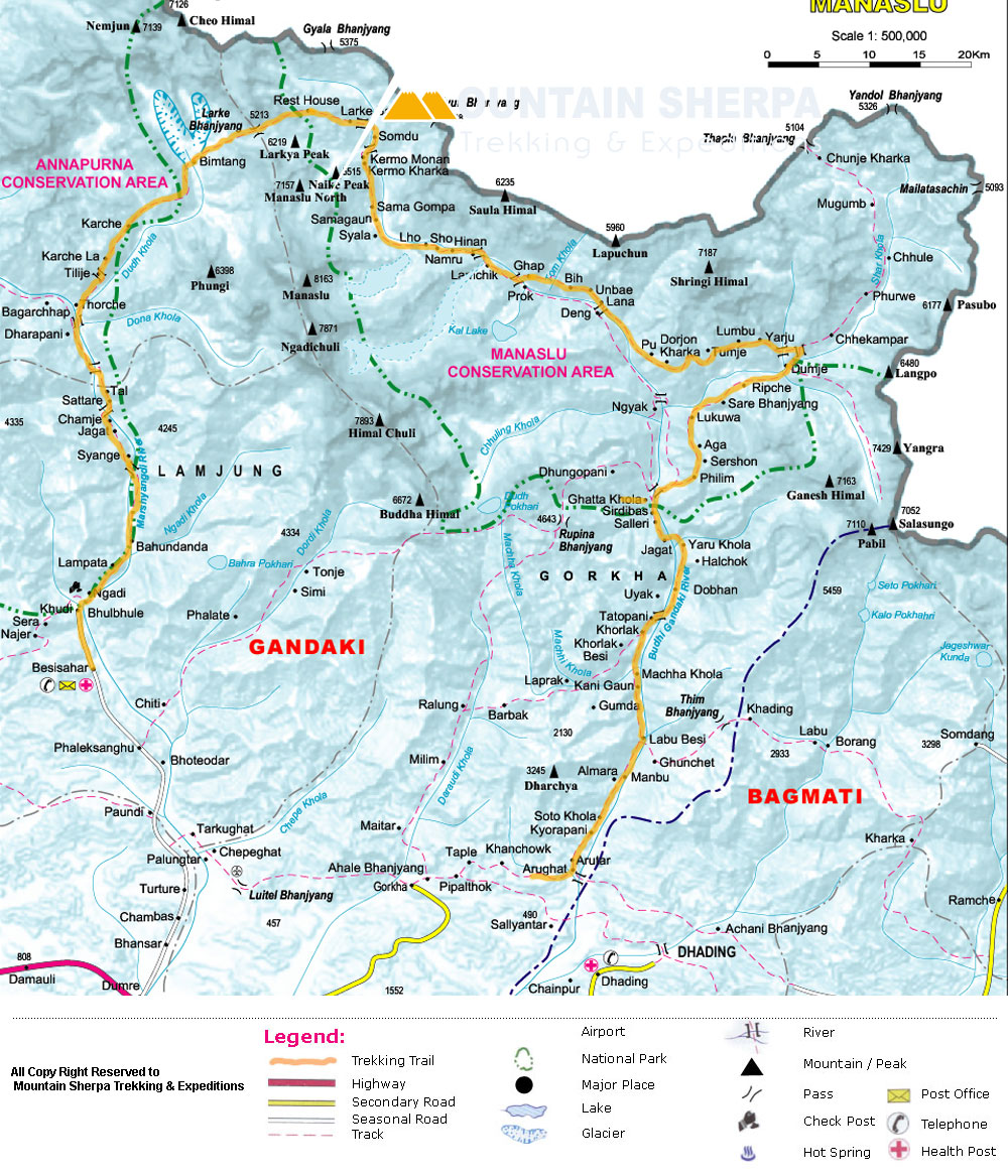 | ジャパニーズ・ピークとして知られるマナスルの3つのピークを見るトレック。トリスリ・バザールからブディ(ブリ)・ガンダギ川の切り立った大峡谷を通って、対照的な景観のサマへ。雪のラルキャ・ラ(峠)を越え、マルシャンディ・コーラ(川)に下る。 健脚に自信のあるひとにおすすめ。 ロッジ宿泊 |