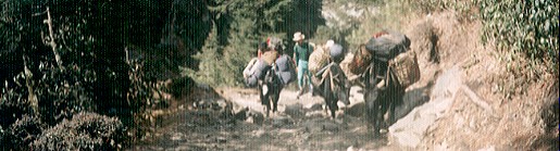 牛に引かれて善光寺? ・・テントや食糧を背にヤクがヒマラヤの麓を行く |
